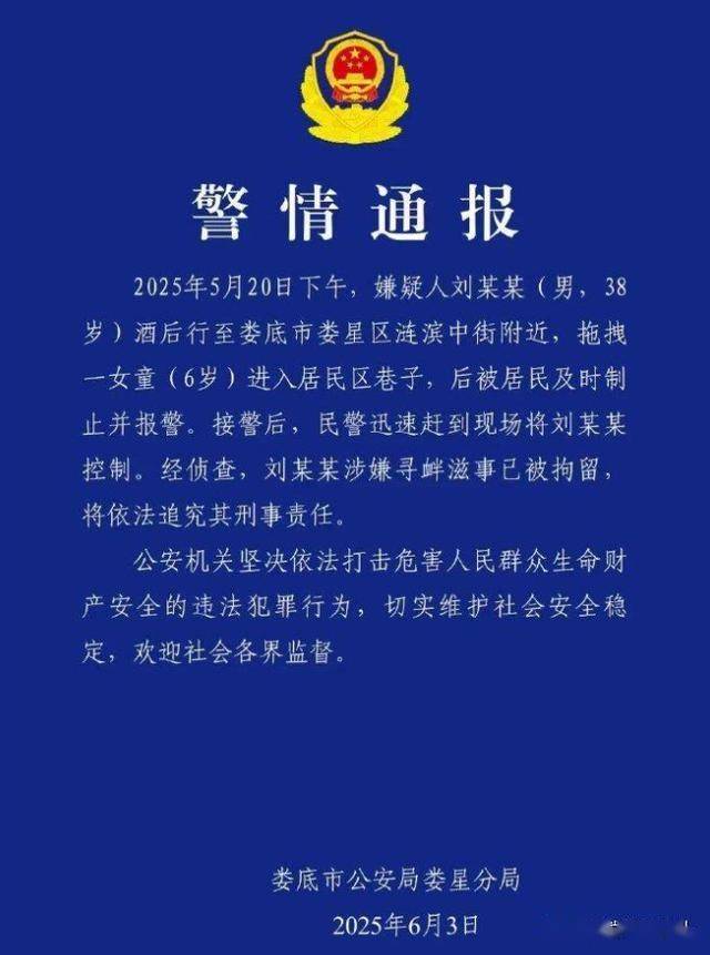 《刘某某(男,38岁)拖拽6岁女童进小巷,警方通报》,2025年6月3日