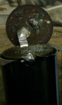 引线条不断被腐蚀,甚至被蚀断,硬梗部出现腐蚀凹坑。腐蚀处会出现大量堆积析出物。灰白色、黑色或略带黄色的糊状腐蚀物。经分析主要有3种,①白色絮状的氧化铝沉淀物,②白色半透明的凝胶状氢氧化铝,③黑色疏松的氧化铝剥落层。其他带色则可能与氯离子来源有关。例如盖板中的氯离子往往伴随着带色的纤维素进入电解液,因而造成腐蚀斑痕或堆积物带有其他颜色。放置一段时间可能会生成绿色霉点。由于腐蚀过程中附加产氢,所以会引起鼓底爆炸。